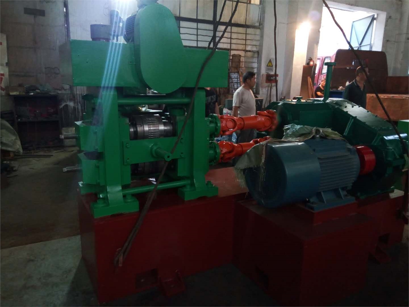 4、拉盘机: 该机以电磁调速电机为动力,驱动箱体内多级齿轮传动至主轴和多层线鼓,牵引钢筋运转,是生产线的主要动力机构。调整调速电机可以改变轧制速度。根据轧制钢筋直径的大小,可以适应各种规格产品的生产。